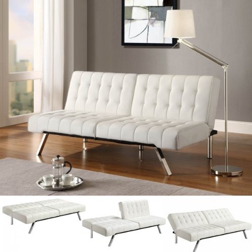 This versatile, multi-position split-back sofa sleeper features rich, water resistant faux-leather which wipes clean and sleek, stylish chrome legs . It easily changes from sofa, to lounger and sleeper with its multi position back and click clack technology. The cushioning is made of high-density polyester and foam for a firm mattress, making it both stylish and comfortable. Also available in white. Some assembly required.SAVE NOW on the special offers below!